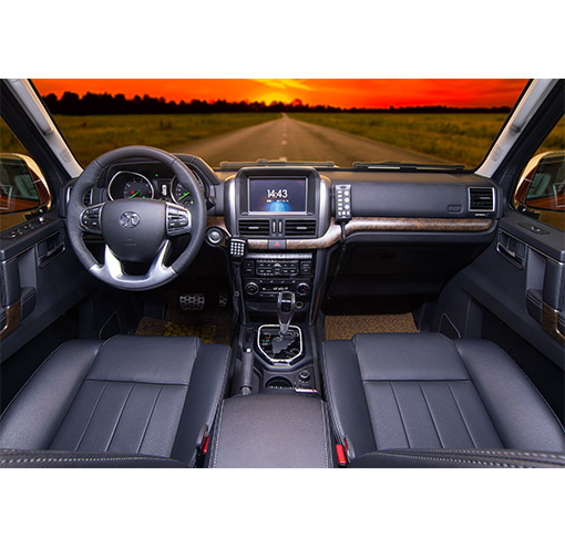电子四轮驱动、智能一键启动系统、发动机电子防盗系统、车内中控锁、主副驾驶安全气囊、电动外后视镜(带折叠加热功能)、四门电动门窗、真皮方向盘、真皮座椅、驾驶座六项调节含记忆功能、空调、USB输入接口,8英寸液晶显示屏、蓝牙系统、倒车雷达、倒车影像,GPS导航、氙气大灯、LED日间行车灯、电子ABS+EBD、刹车辅助HBA、非承载式全金属车身。