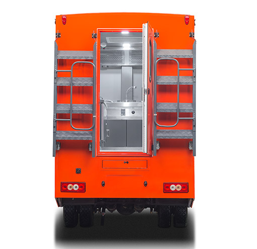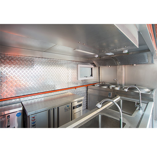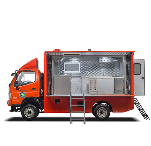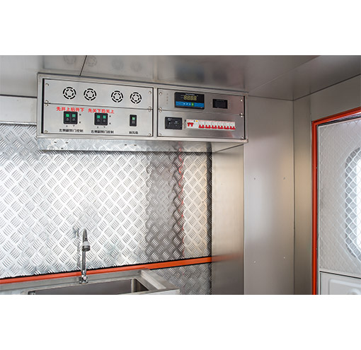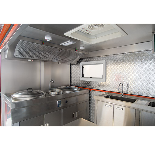 车辆配备:军工级车载二联灶(一炒灶、一汤灶)、抽油烟机、大容量电压力锅(电饭煲)、开水器、冷藏柜、储物吊柜、不锈钢洗菜料理台、餐具套装及行车供电系统。