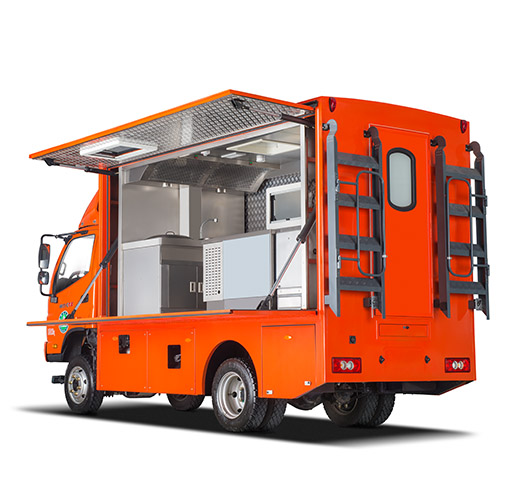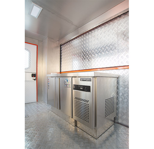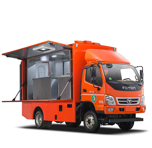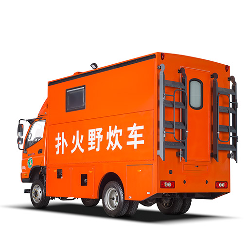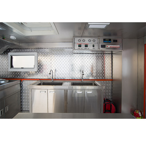 车辆配备:军工级车载二联灶(一炒灶、一汤灶)、抽油烟机、大容量电压力锅(电饭煲)、开水器、冷藏柜、储物吊柜、不锈钢洗菜料理台、餐具套装及行车供电系统。
